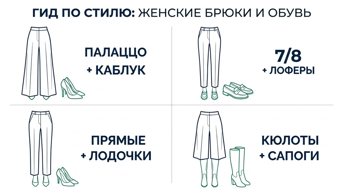 К брюкам палаццо нужна обувь на каблуке — брюки должны почти касаться пола (расстояние 1–1,5 см). Балетки и плоские кеды разрушают линию, «опуская» весь силуэт. К зауженным брюкам 7/8 подходят лоферы, оксфорды и туфли «Мэри Джейн» — открытая щиколотка визуально облегчает нижнюю часть образа. К классическим прямым брюкам — лодочки или ботильоны с узким мысом; спереди должен образовываться один мягкий залом. Кюлоты требуют либо высоких сапог (голенище уходит под брючину), либо туфель в цвет кожи для оптического удлинения ноги: ботильоны, заканчивающиеся встык с брюками, визуально «режут» ногу пополам.