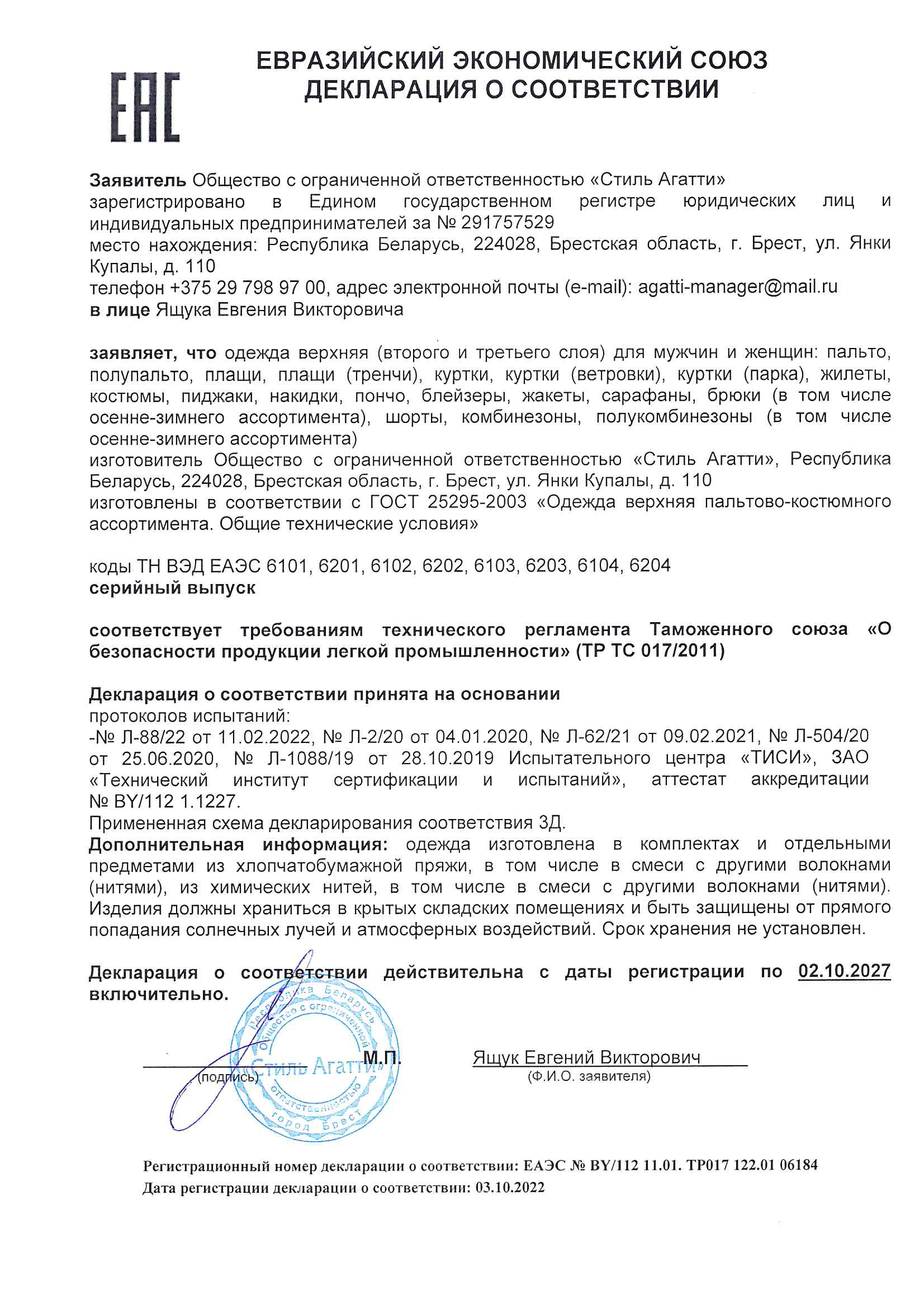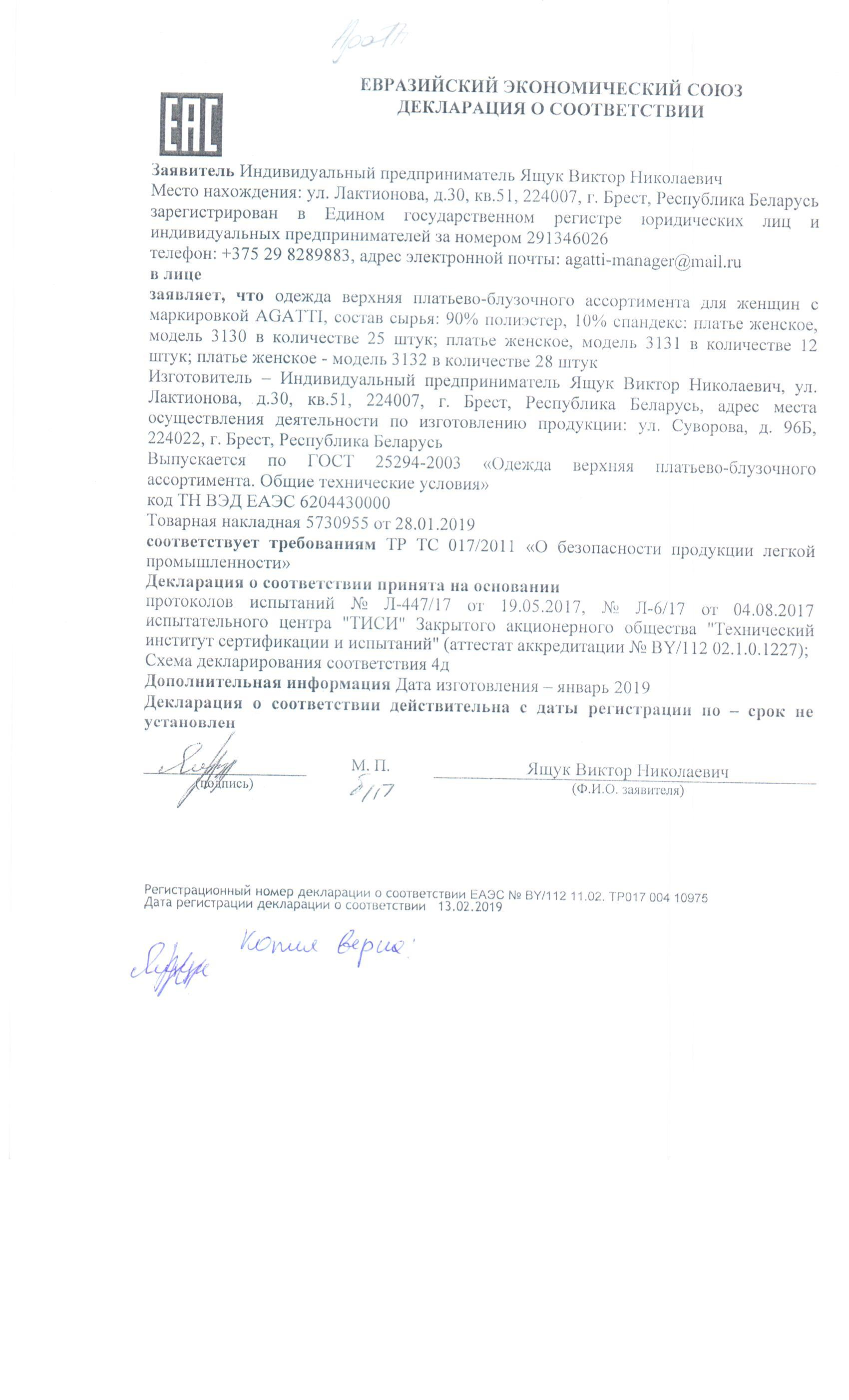 Качество одежды, представленной на сайте, подтверждено Декларацией соответствия Таможенного союза. Этот документ даёт право на реализацию товара на территории России, Беларуси, Казахстана, Армении, Киргизии без дополнительных проверок внутри страны. Наличие Декларации соответствия ТС делает процесс выхода товара на рынок максимально удобным и быстрым.