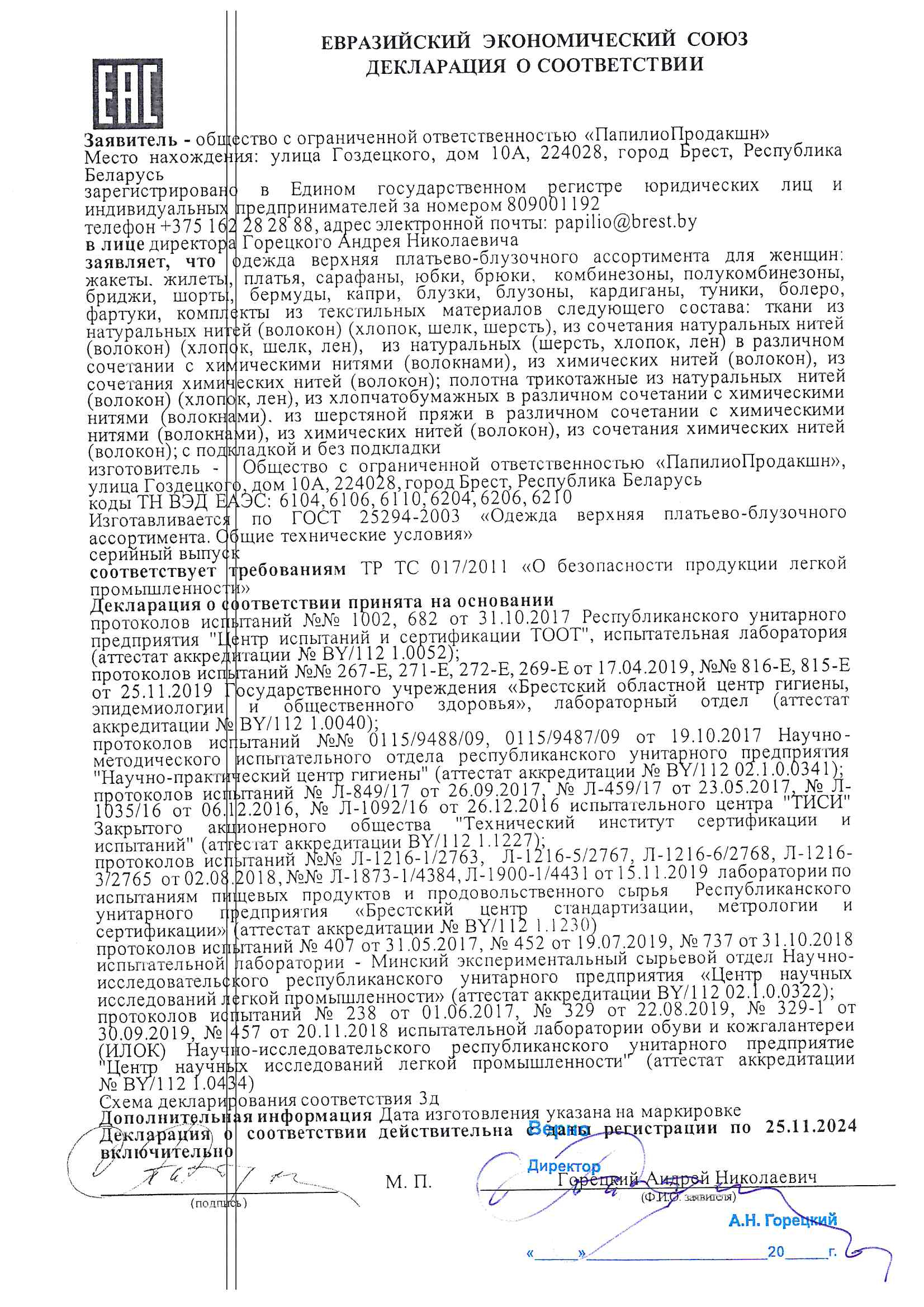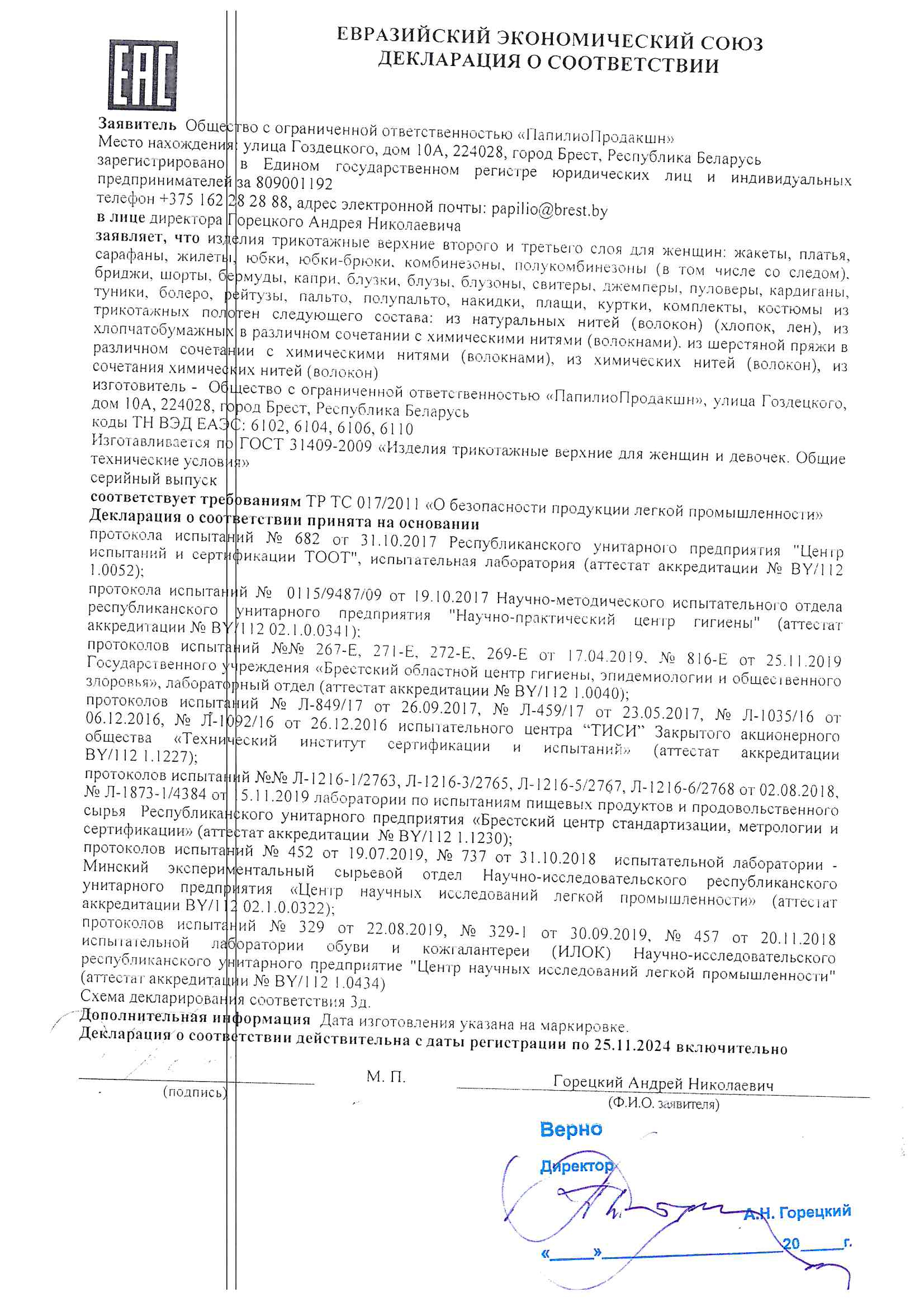 Качество одежды, представленной на сайте, подтверждено Декларацией соответствия Таможенного союза. Этот документ даёт право на реализацию товара на территории России, Беларуси, Казахстана, Армении, Киргизии без дополнительных проверок внутри страны. Наличие Декларации соответствия ТС делает процесс выхода товара на рынок максимально удобным и быстрым.