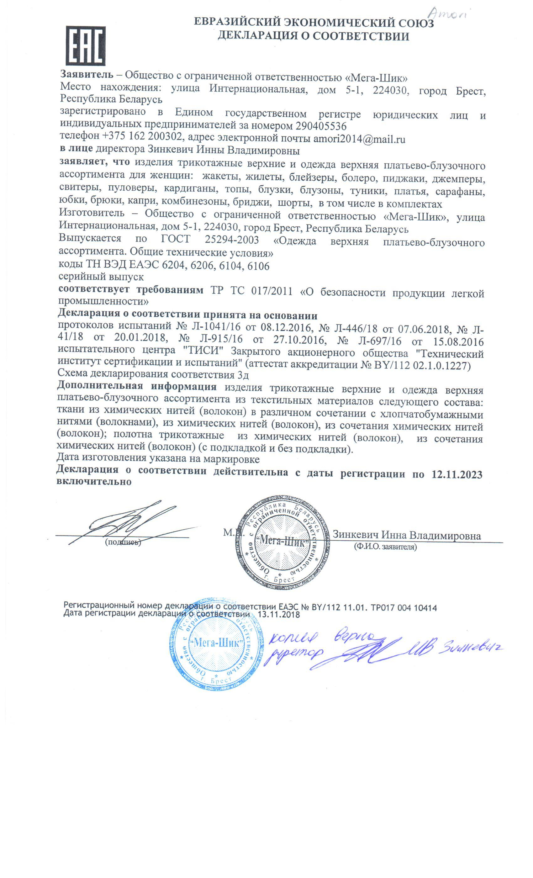 Качество одежды, представленной на сайте, подтверждено Декларацией соответствия Таможенного союза. Этот документ даёт право на реализацию товара на территории России, Беларуси, Казахстана, Армении, Киргизии без дополнительных проверок внутри страны. Наличие Декларации соответствия ТС делает процесс выхода товара на рынок максимально удобным и быстрым.