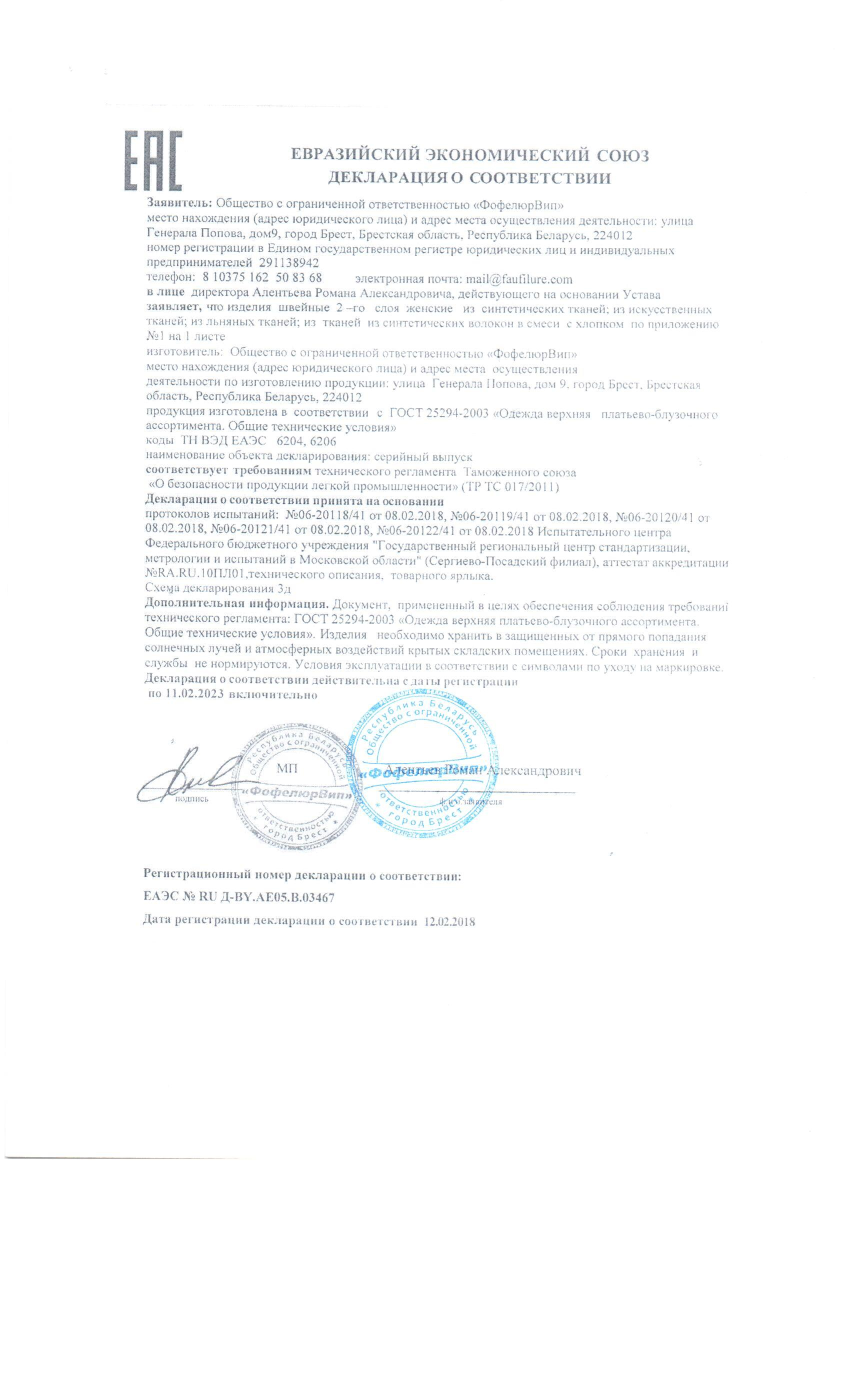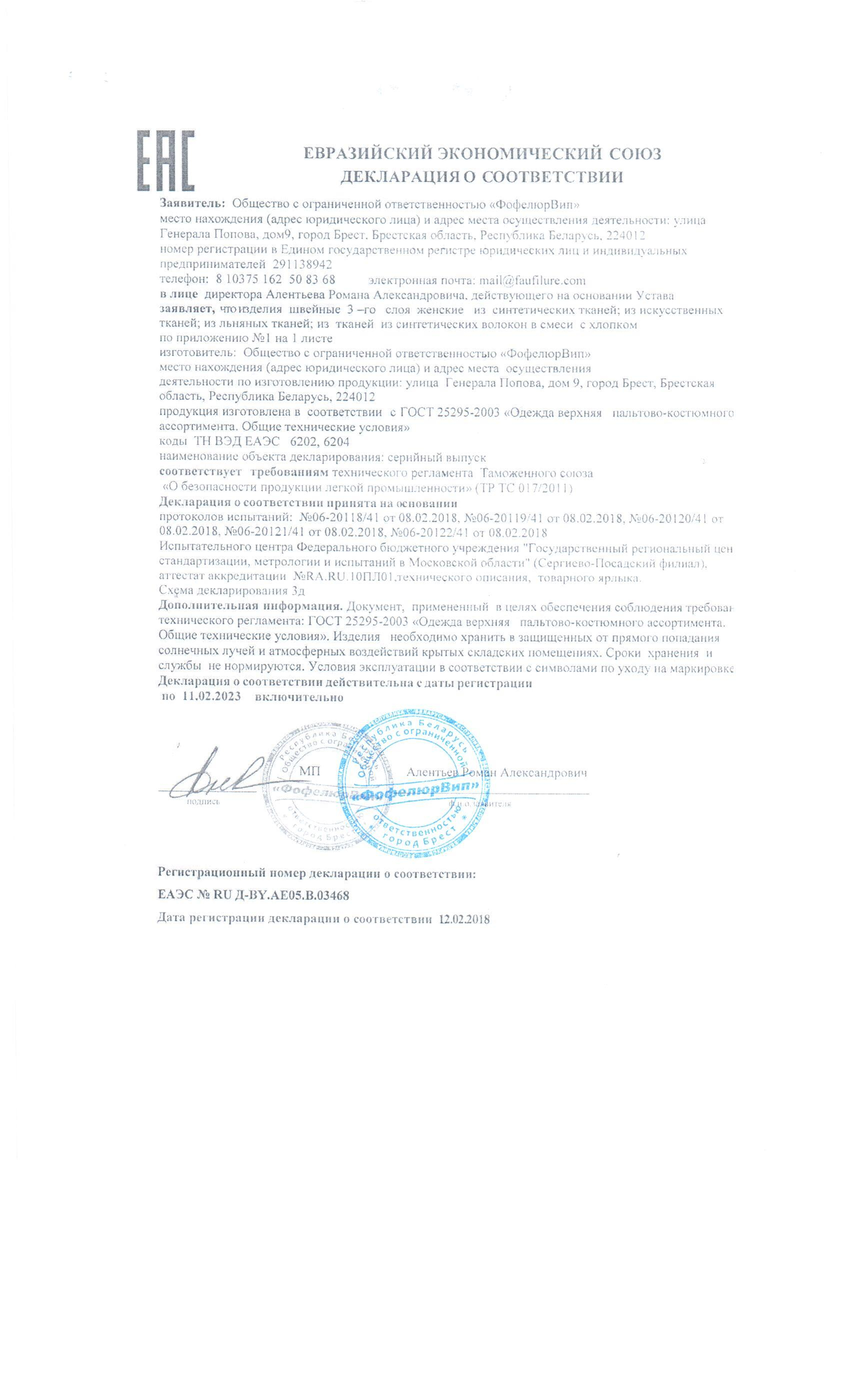 Качество одежды, представленной на сайте, подтверждено Декларацией соответствия Таможенного союза. Этот документ даёт право на реализацию товара на территории России, Беларуси, Казахстана, Армении, Киргизии без дополнительных проверок внутри страны. Наличие Декларации соответствия ТС делает процесс выхода товара на рынок максимально удобным и быстрым.