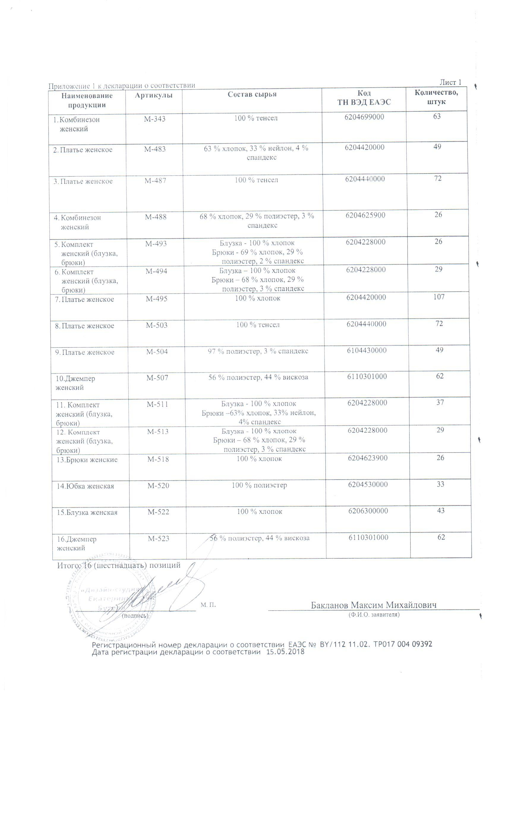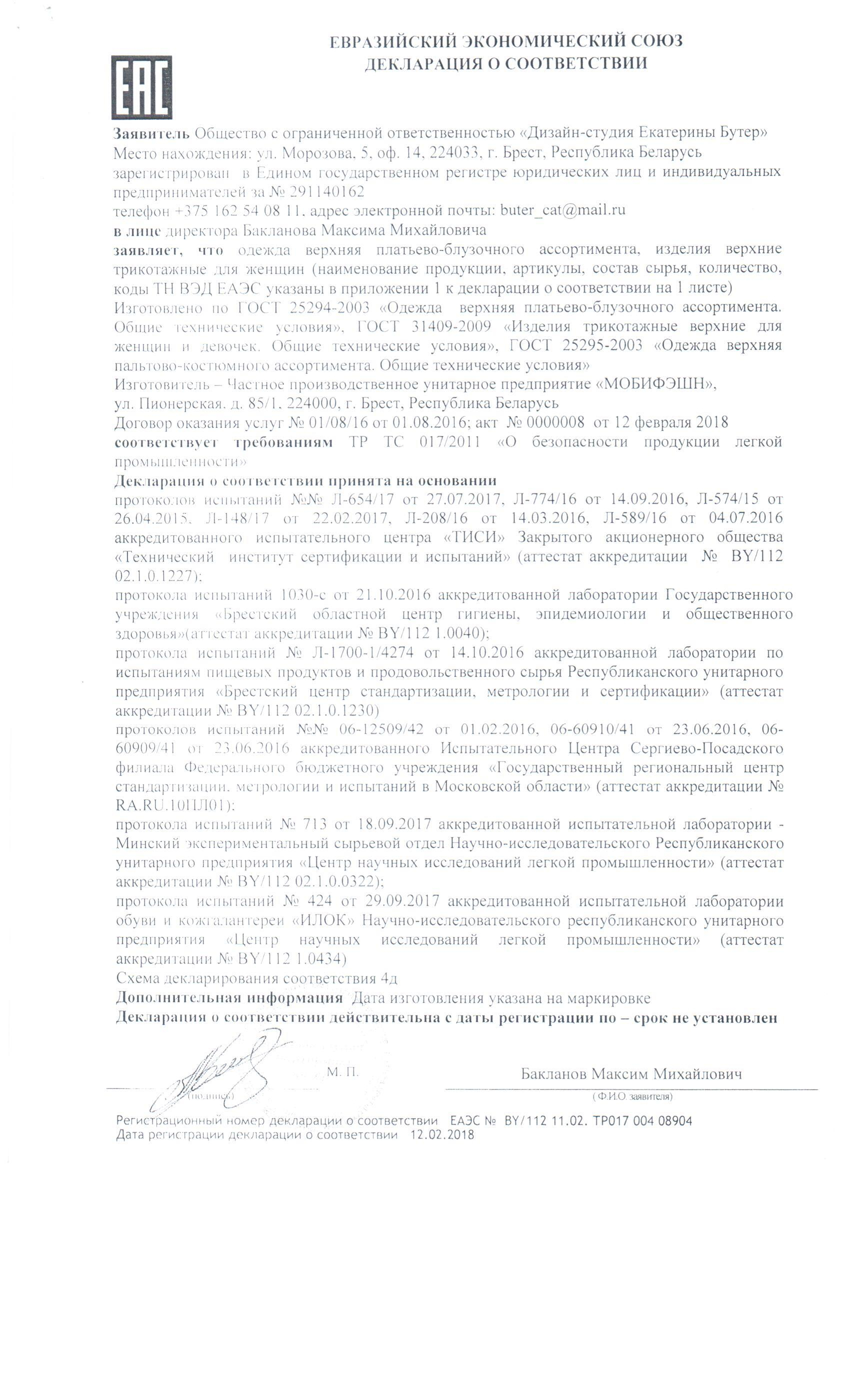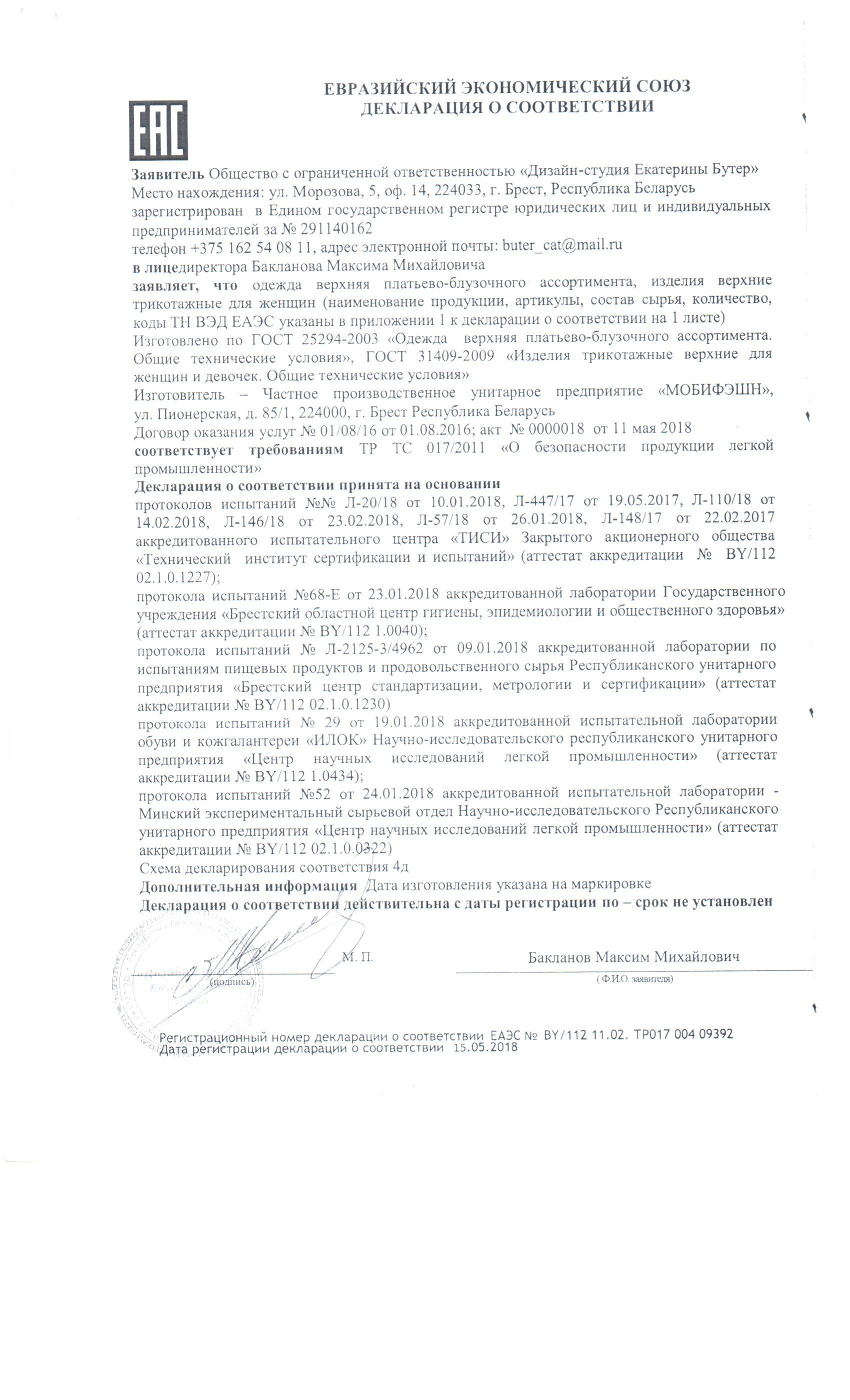 Качество одежды, представленной на сайте, подтверждено Декларацией соответствия Таможенного союза. Этот документ даёт право на реализацию товара на территории России, Беларуси, Казахстана, Армении, Киргизии без дополнительных проверок внутри страны. Наличие Декларации соответствия ТС делает процесс выхода товара на рынок максимально удобным и быстрым.