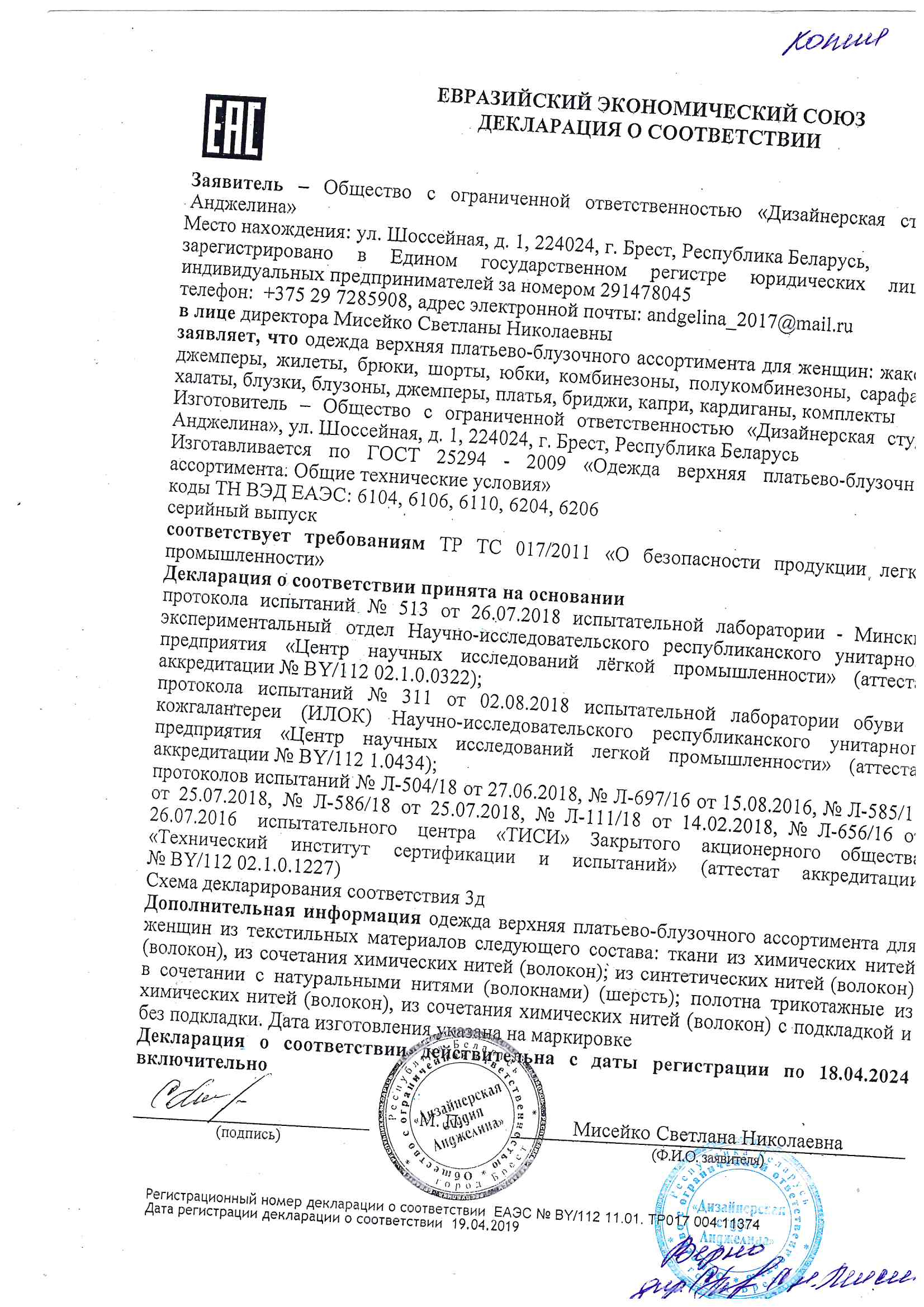 Качество одежды, представленной на сайте, подтверждено Декларацией соответствия Таможенного союза. Этот документ даёт право на реализацию товара на территории России, Беларуси, Казахстана, Армении, Киргизии без дополнительных проверок внутри страны. Наличие Декларации соответствия ТС делает процесс выхода товара на рынок максимально удобным и быстрым.