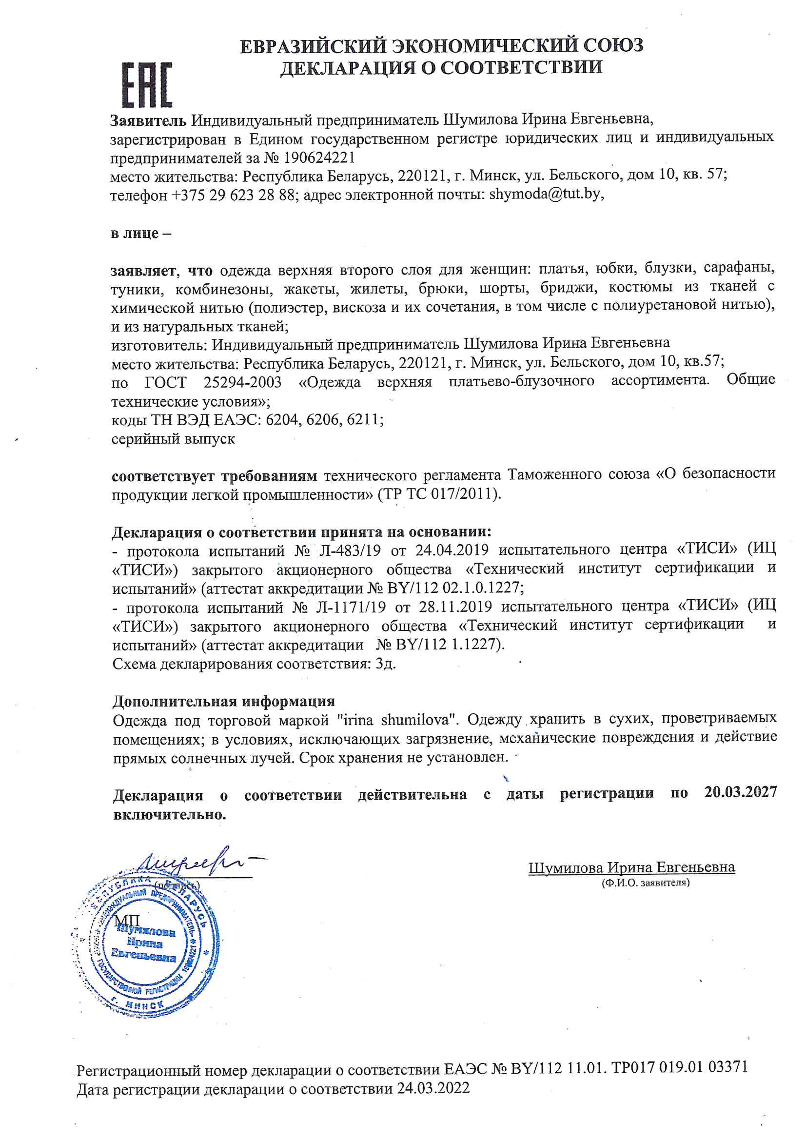 Качество одежды, представленной на сайте, подтверждено Декларацией соответствия Таможенного союза. Этот документ даёт право на реализацию товара на территории России, Беларуси, Казахстана, Армении, Киргизии без дополнительных проверок внутри страны. Наличие Декларации соответствия ТС делает процесс выхода товара на рынок максимально удобным и быстрым.