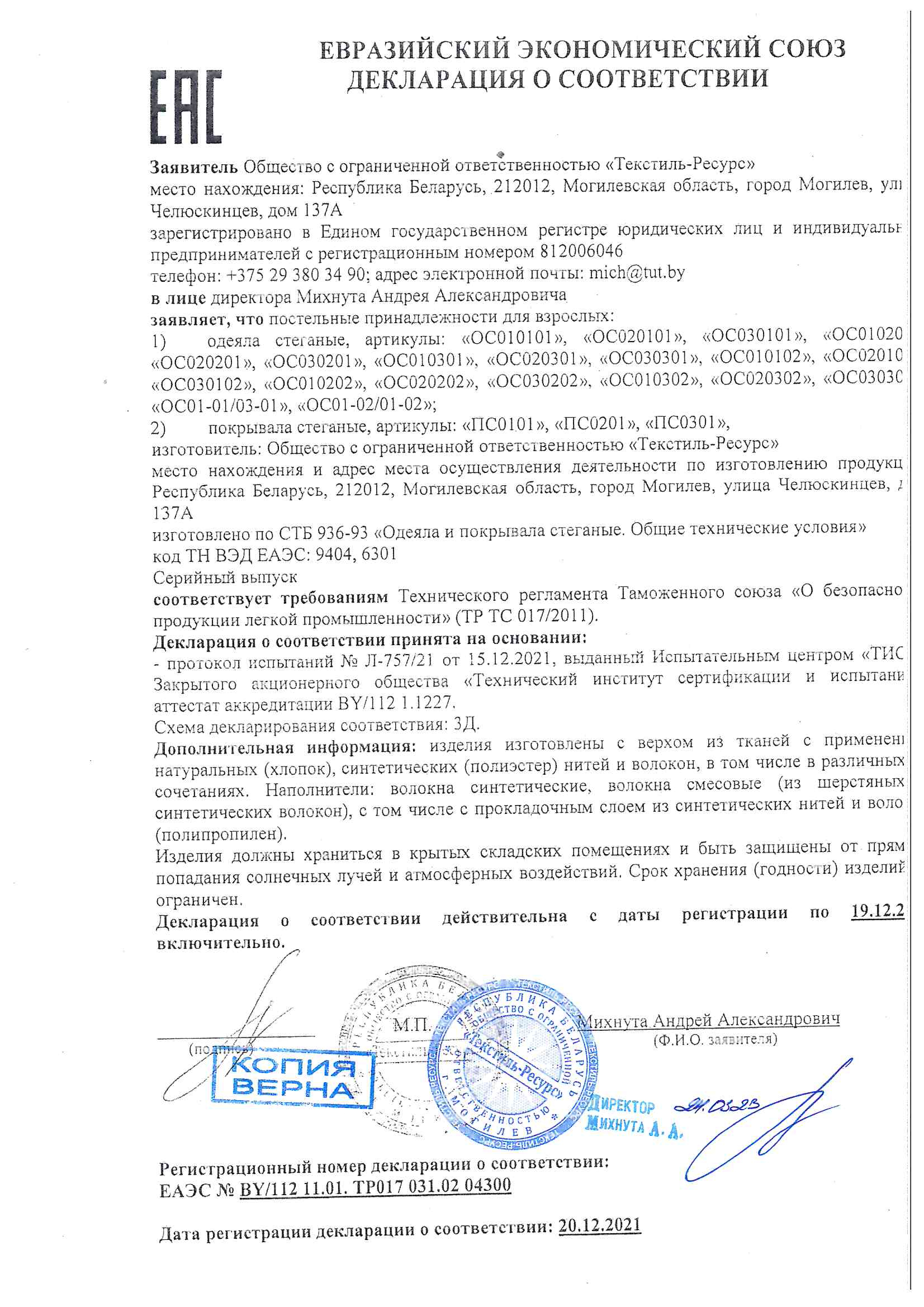 Качество одежды, представленной на сайте, подтверждено Декларацией соответствия Таможенного союза. Этот документ даёт право на реализацию товара на территории России, Беларуси, Казахстана, Армении, Киргизии без дополнительных проверок внутри страны. Наличие Декларации соответствия ТС делает процесс выхода товара на рынок максимально удобным и быстрым.