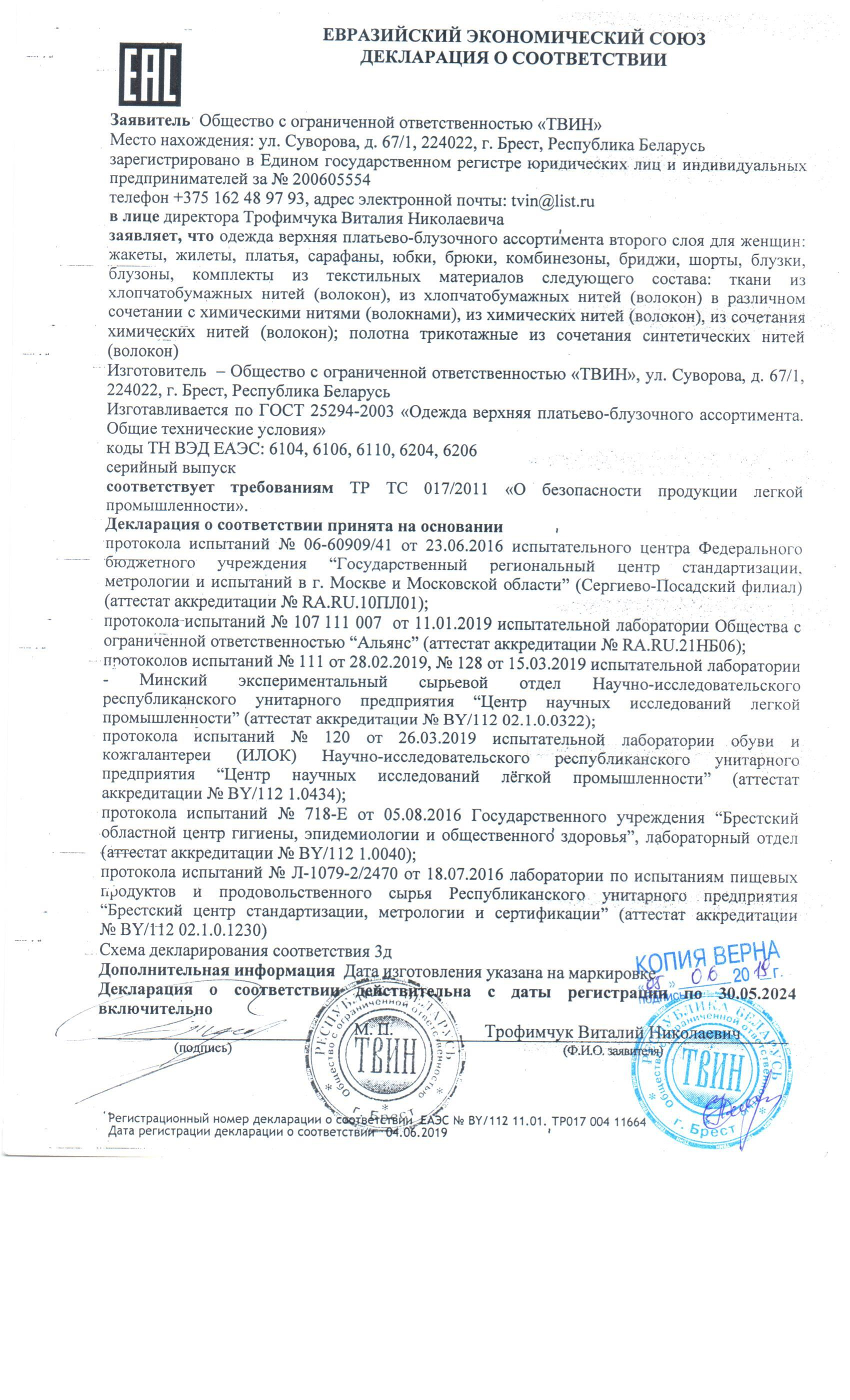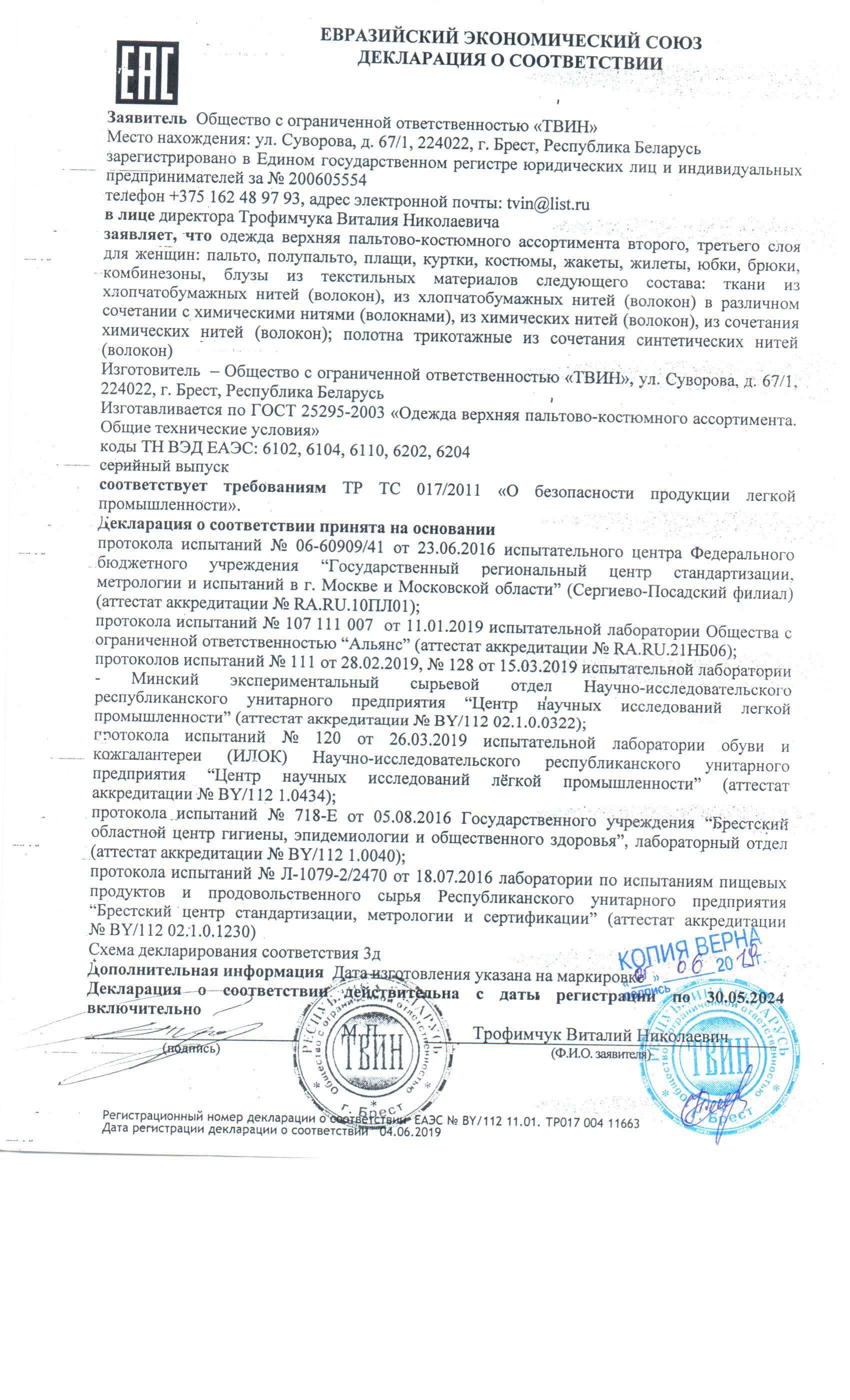 Качество одежды, представленной на сайте, подтверждено Декларацией соответствия Таможенного союза. Этот документ даёт право на реализацию товара на территории России, Беларуси, Казахстана, Армении, Киргизии без дополнительных проверок внутри страны. Наличие Декларации соответствия ТС делает процесс выхода товара на рынок максимально удобным и быстрым.
