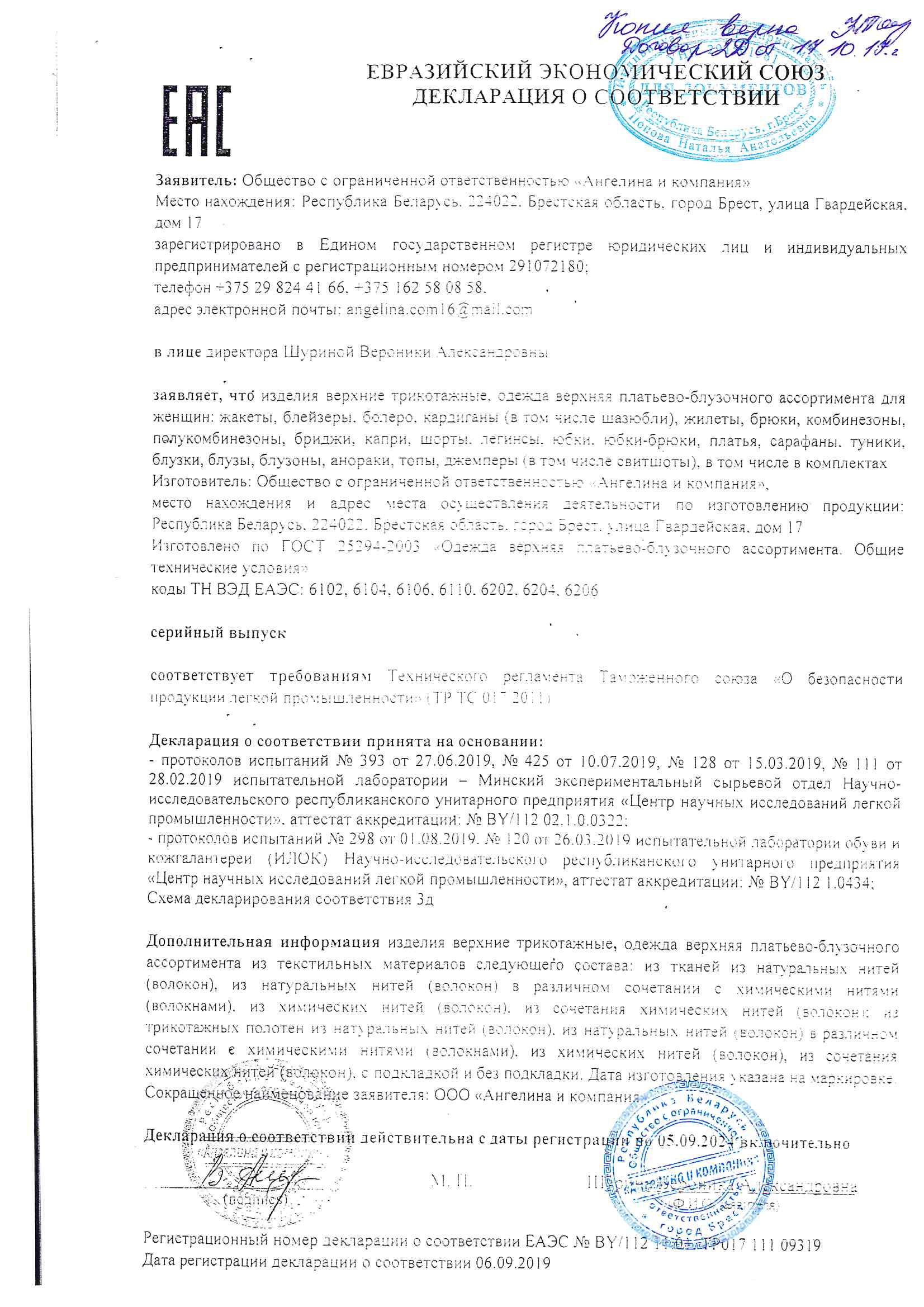 Качество одежды, представленной на сайте, подтверждено Декларацией соответствия Таможенного союза. Этот документ даёт право на реализацию товара на территории России, Беларуси, Казахстана, Армении, Киргизии без дополнительных проверок внутри страны. Наличие Декларации соответствия ТС делает процесс выхода товара на рынок максимально удобным и быстрым.