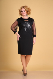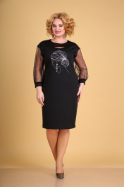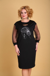 Роскошное платье на все случаи жизни, выполненное из трикотажного полотна в сочетании с сеткой в горошек. Силуэт-полуприлегающий. Перед на фигурной кокетке с интригующим открытым участком. В области груди по центру расположен принт с фольгированным элементом. На спинке в среднем шве расположена застежка на декоративную молнию и шлица. Горловина округлая, расширенная по плечевым швам. Рукав на спущенной пройме, длиной 3/4,сильно расширенный книзу. Низ рукава оформлен эластичной манжетой. Платье без подкладки и плечевых накладок. Длина спинки-100см Длина рукава от горловины -65см