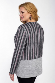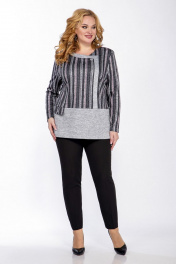 Джемпер полуприлегающего силуэта с втачным рукавом. Перед блузы с круглой горловиной и двумя вытачками выходящими из бокового шва. По переду в области линии талии горизонтальный подрез, а также по переду расположена фигурная планка. В углу планки пришита пуговица. Длина - 68 см. Длина рукава - 60 см, ширина рукава - 38-40 см
