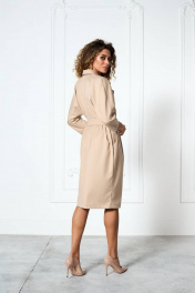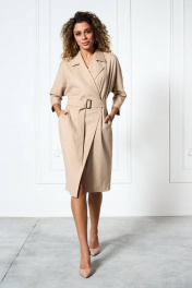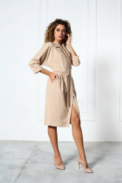 Платье полу прилегающего силуэта на «запах» с цельно-кроёным рукавом. Воротник отложной пиджачного типа, отрезное по линии талии. По переду боковые карманы со складками. Низ платья и низ рукава — на подгибке. Застёжка бвубортная на петлю и пуговицу, пояс-съёмный.