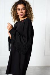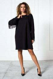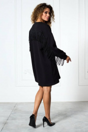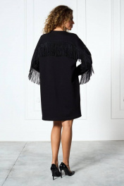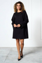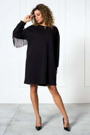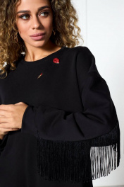 Платье «оверсайз» из трикотажной ткани, прямого силуэта со спущенной плечевой линией. Спинка и рукав с декоративными подрезами, в которые вставлена тесьма с бахромой. По переду платье декорировано съемной брошью. Низ рукава — на притачной манжете. Низ платья — на подгибке.