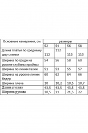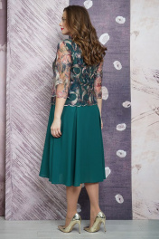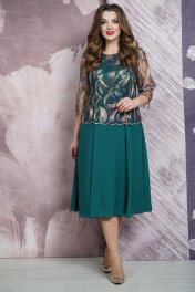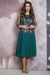 Платье прилегающего силуэта. По переду рельефные швы, по спинке средний шов и вытачки. Округлый вырез горловины. В среднем шве спинки застежка молния. Рукав втачной длиной ¾. Юбка платья расклешенная, по переду и спинке встречные складки, 2 сзади и 2 спереди. Верх платья и рукава выполнены из ружевной ткани (на сетке вышивка) и фигурным краем по низу. Платье на трикотажной подкладке.