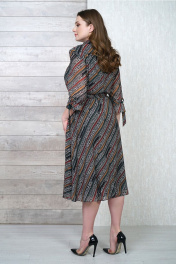 Платье женское, отрезное по линии талии. Лиф переда и спинки с рельефными швами. По переду притачная планка. Рукав втачной, по низу притачной волан. По шву притачивания волана рукава завязка, состоящая из основной ткани и нижней отделочного цвета. Нижняя часть платья полусолнце. В боковых швах внутренние карманы. Платье на трикотажной подкладке. По талии втачной пояс на широкой резинке. Застежка платья спереди на петли и пуговицы. Воротник стояче-отложной на стойке. Платье по талии завязывается на пояс, состоящий из основного и отделочного цвета. Ткань шифон производства Турции.