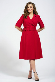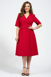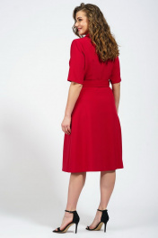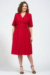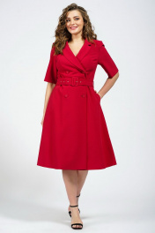 Платье прилегающего силуэта, отрезное по линии талии. Верхние части переда и спинки с рельефными швами, по спинке средний шов. Платье двухбортное, застежка на петли и пуговицы. Нижние части переда и спинки расклешённые к низу, в боковых швах внутренние карманы. Рукав втачной до локтя. Воротник с отложными лацканами. Платье со съемным поясом.