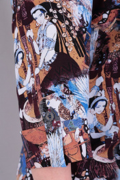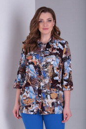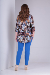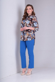 Комплект женский, состоящий из блузки и брюк. Блузка из приятной на ощупь ткани с эффектным принтом, прямого силуэта, удлиненная по спинке, с плечевыми накладками. С центральной застежкой на отрезной планке на 8 пуговиц. Воротник рубашечного типа на отрезной стойке. Перед блузки с нагрудными выточками. Длина по спинке 84 см. Рукава втачные , одношовные с отложной манжетой длиной 45см. Манжету фиксирует пата. Брюки из слегка стрейчевой ткани, укороченные, зауженные к низу, на поясе-обтачке с двумя пуговицами. Длина брюк 96см