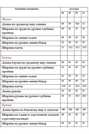 Костюм состоит из жилета ,блузки и брюк. Блузка прямого силуэта длиной до линии бедер, с разрезами в боковых швах. Перед с нагрудными вытачками и центральной потайной застежкой. Воротник отложной со стойкой рубашечного типа. Спинка с кокеткой и встречной складкой от кокетки вниз. Спинка длиннее переда. Рукав прямой одношовный , длиной ¾. По низу широкая фигурная манжета с декоративными завязками. Жилет полуприлегающего силуэта длиной ниже линии бедер с фигурным низом. Перед без застежки спереди с круглой горловиной. Слева нагрудная вытачка и 1 прорезной карман в рамку с навесной петлей и пуговицей. Справа косой рельеф –подрез со складкой. Левая часть переда длиннее правой. Спинка со средним швом и талиевыми вытачками. Левая часть спинки длиннее переда. Пояс съемный с пряжкой. Брюки со стрелками, длинные, зауженные к низу. Карманы наклонные в боковых швах. Спереди имитация карманов в листочку. Застежка спереди на замок-молния и 1 петлю и пуговицу на поясе. Пояс притачной с 5 шлевками и эластичной тесьмой по бокам.