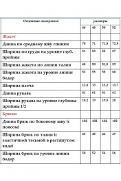 Брючный костюм. Жакет полуприлегающего силуэта длиной ниже линии бедра, на подкладке. Перед жакета с отрезным бочком и вытачкой вверх от переднего кармана в рамку с клапаном. Воротник отложной с заострёнными лацканами. Спинка со средним швом, отрезным бочком и плечевыми вытачками. Застёжка двубортная на 4 обтяжные пуговицы. Рукав втачной, двухшовный длинный. По локтевому шву внизу 5 декоративных обтяжных пуговиц. Пояс съёмный широкий с обтяжной пряжкой и блочками. Брюки зауженные к низу длинные, со стрелками. В боковых швах наклонные карманы . Пояс притачной с 5 шлёвками и эластичной тесьмой сзади. Застёжка спереди на молнию и две прорезные петли и пуговицы.