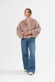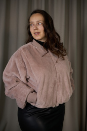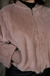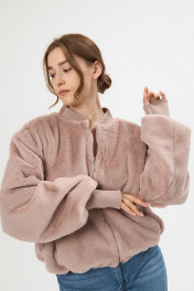 Бомбер женский прямого силуэта из искусственного меха, длиной до линии бёдер. Перед с рельефами, в швах которых обработаны функциональные карманы и центральной застёжкой на металлическую молнию. Рукав объёмный, одношовный, длинный со спущенным плечом, с широким манжетом из кашкорсе, в котором имеется отверстие для большого пальца. Горловина с фигурной втачной стойкой из кашкорсе. Низ бомбера присборен на резинку. Бомбер на поливискозной подкладке, представлен в едином размере. Обхват груди 84-108 см.