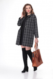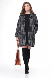Легкое пальто из утепленной костюмной ткани в клетку свободного покроя « оверсайс». Застежка по подборту на потайную кнопку. Воротник невысокий с прямыми углами. По переду глубокие накладные карманы. Плечо спущено, рукав длинный втачной зауженный к низу. Пояс съемный с пряжкой. Пальто на подкладке. Длина пальто 90 см. Длина плеча от горловины 20 см. Длина рукава 52 см. Платье из трикотажного полотна прямого силуэта. Горловина овальная,рукав цельнокроеный, по низу рукава декоративная манжета.Платье без подкладки. Длина 95см. длина рукава от горловины 53 см.