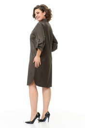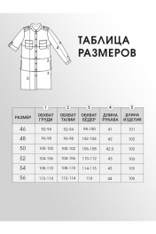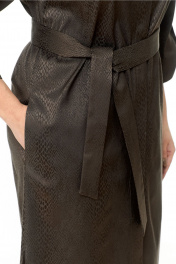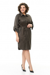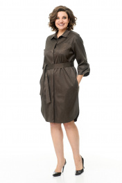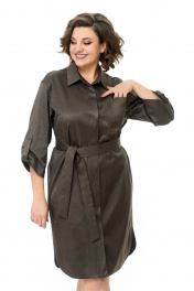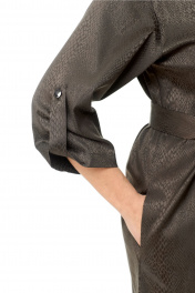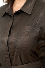Платье-рубашка свободного объёма, прямого силуэта, длиной до линии колена с фигурной линией низа. Классический рубашечный воротник на стойке и планка до низа на пуговицах. У платья потайная сквозная застёжка на притачных планках. Перед дополнен накладным карманчиком. В боковых швах – функциональные карманы. Втачные ¾ рукава с патами. Пояс из основной ткани. Ткань средней плотности темно-коричневого цвета, слегка тянется, с принтом. Без подкладки. Рост фотомодели на изображениях – 172 см., размер фотомодели – 54. Замеры, в которых: ОГ-объем груди; ОТ – объем талии; ОБ-объём бедер; ДИ-длина изделия; ДР – длина рукава; ШП – ширина по плечам (расстояние между швами втачивания рукавов). Рост фотомодели – 172 см. Размер фотомодели – 54. Размер 46. ОГ – 92-94; ОТ – 92-94; ОБ – 98-100; ДИ – 101; ДР – 41; ШП – 46 Размер 48. ОГ – 96-98; ОТ – 96-98; ОБ – 102-104; ДИ – 102; ДР – 42; ШП – 47 Размер 50. ОГ – 100-102; ОТ – 100-102; ОБ – 106-108; ДИ – 102; ДР – 42,5; ШП – 48 Размер 52. ОГ – 104-106; ОТ – 104-106; ОБ – 110-112; ДИ – 103; ДР – 43; ШП – 49 Размер 54. ОГ – 108-110; ОТ – 108-110; ОБ – 114-115; ДИ – 105; ДР – 43; ШП – 50 Размер 56. ОГ – 112-114; ОТ – 112-114; ОБ – 118; ДИ – 106; ДР – 44; ШП – 51