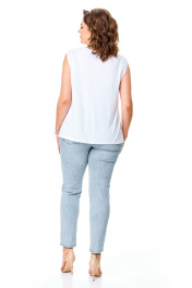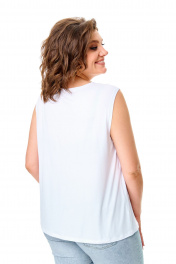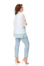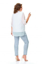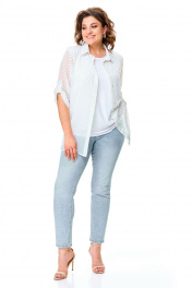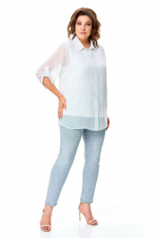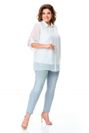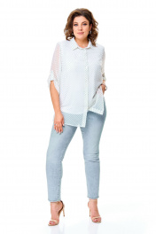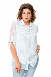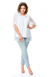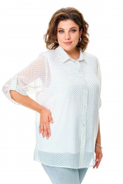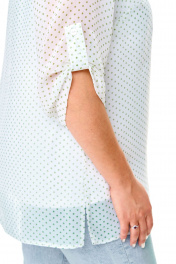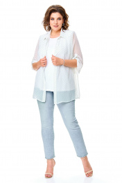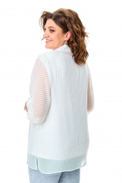 Комплект-двойка, состоящий из шифоновой легкой блузы и трикотажной белой майки-топа на широких бретелях без регулировки. Модель свободного силуэта. Рукава втачные с подплечниками, ¾, с патой – с отворотом и хлястиком с пуговицей, что позволяет регулировать длину рукавов. Блузка имеет классический отложной рубашечный воротник. С нагрудными вытачками. Застежка на петли и на пуговицы. Линия низа прямая, боковые швы заканчиваются разрезами. Ткань – легкий воздушный дышащий шифон, просвечивается, с принтом в мелкий зеленый горох. В комплект входит трикотажная майка-топ с широкими нерегулируемыми бретелями без рукавов белого цвета с нагрудными вытачками, которая выполняет роль легкой дышащей подкладки, но майку, как и блузу можно одевать отдельно. Блузу из комплекта можно смело одевать без майки с красивым нижним бельем в теплые летние дни. Ткань блузона не тянется, ткань майки эластичная, отлично тянется. Сама майка свободная, как и воздушный яркий блузон. Для более полного представления о модели комплекта посмотрите так же видеоролик к этой модели и к моделям 5020 – 5030. Все эти нарядные комплекты – это нарядная женская одежда больших размеров. Мы задумали эту модель, чтобы любая женщина с пышными формами могла сгладить особенности своей фигуры, надев эти блузоны с майкой. При этом этот наряд в гардеробе может быть и повседневным. Каждая партия нашей одежды для женщин индивидуальна и выпускается незначительными, ограниченными партиями, поэтому найти точно такую же блузу или платье на многомиллионном просторе будет сложно. Данные модели имеют ограниченное количество в выпуске. Повторы в текущем летнем сезоне не планируются. Средняя длина блуз в размерах по спинке около 82 сантиметров. Длина рукавчиков по пате около 36 сантиметров, с расстегнутой патой – 45 см. Точные замеры в каждом размере блузы и маек прилагаются к описанию ниже. Фотомодель на фотографиях ростом 173 сантиметра, с обхватом груди – 103, талии – 79, бедер – 115 см. Размер – 54. Важная информация – данная модель «большемерит». Фактические замеры изделий (в готовом виде), в которых: ОГ – обхват груди; ОТ – обхват талии; ОБ – обхват бедер; ДИ – длина изделий (по спинке); ДР – длина рукава (от втачного шва у плеча до края рукавчика при расстегнутой пате); ШП – ширина по плечам. Рост фотомодели – 173 см, размер фотомодели – 54. Размер 54 Блуза ОГ – 108-120; ОТ – 120; ОБ – 124; ДИ – 81; ДР – 44; ШП - 43 Майка-топ ОГ – 108-116; ОТ – 118; ОБ – 126; ДИ – 64 Размер 56 Блуза ОГ – 112-124; ОТ – 124; ОБ – 128; ДИ – 82; ДР – 44; ШП - 43 Майка-топ ОГ – 112-120; ОТ – 122; ОБ – 130; ДИ – 64 Размер 58 Блуза ОГ – 116-128; ОТ – 128; ОБ – 132; ДИ – 83; ДР – 45; ШП - 44 Майка-топ ОГ – 116-124; ОТ – 126; ОБ – 134; ДИ – 65 Размер 60 Блуза ОГ – 120-132; ОТ – 132; ОБ – 136; ДИ – 83; ДР – 45; ШП - 44 Майка-топ ОГ – 120-128; ОТ – 130; ОБ – 138; ДИ – 66 Размер 62 Блуза ОГ – 124-136; ОТ – 136; ОБ – 140; ДИ – 83; ДР – 45; ШП - 44 Майка-топ ОГ – 124-132; ОТ – 134; ОБ – 142; ДИ – 66 Размер 64 Блуза ОГ – 128-140; ОТ – 140; ОБ – 144; ДИ – 84; ДР – 45; ШП - 45 Майка-топ ОГ – 128-136; ОТ – 138; ОБ – 146; ДИ – 67 Размер 66 Блуза ОГ – 132-144; ОТ – 144; ОБ – 148; ДИ – 84; ДР – 45; ШП - 45 Майка-топ ОГ – 132-140; ОТ – 142; ОБ – 150; ДИ – 67 "