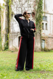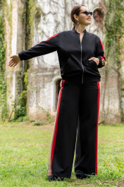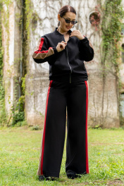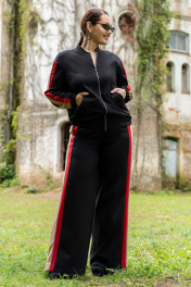 Костюм женский брючный состоящий из бомбера ,брюк. Модный соременный бомбер из премиум трикотажа, с центральной бортовой застёжкой на тесьму-молнию. Горловина круглой формы со стойкой. По низу, и по низу рукавов обработаны манжеты с эластичной резинкой, на полочках прорезные карманы с листочками и отделочными строчками. Рукава втачные со вставками по центру рукавов, по низу с притачной манжетой с эластичной резинкой. Спинка цельная. Брюки женские прямого кроя, на притачном поясе по переду и с резинкой по спинке. Передние половинки с карманами в швах. Брюки по боковым швам со вставкой из конрастной ткани. По передней вставке пояса обработа ны шлёвки и декоративная подвеска.