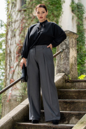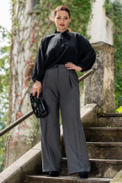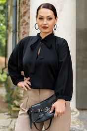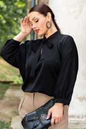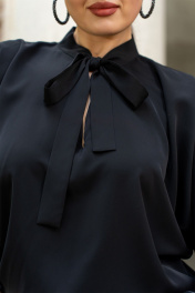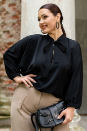 Элегантная женская блузка черного цвета, выполненная в стиле "летучая мышь", идеально подойдет как для торжественного мероприятия, так и для повседневной носки. Блузка со стойкой-завязкой, добавляющими изысканности образу. Цельнокроеные рукава с застежкой на петлю и пуговицу.Асимметричный низ блузки спереди короче, сзади длиннее, что придает дополнительный стиль. Эта блузка станет изысканным дополнением к вашему гардеробу.
