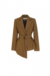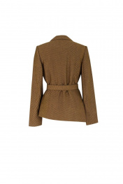 Жакет из костюмно-плательной ткани, полуприлегающего силуэта со смещенной бортовой застежкой на три пришивные кнопки. Петля левой части переда застегивается на пуговицу, пришитую со стороны подборта правой части переда. Перед жакета ассиметричной формы, с талевыми и нагрудными вытачками, из бокового шва, на левой части переда прорезной карман с листочкой с втачными концами. Спинка с плечевыми и талевыми вытачками. Рукава втачные, двухшовные, длинные. Воротник отложной с отворотами из подбортов. Жакет на подкладке, с плечевыми вытачками, со съемным поясом, застегивающимся на пряжку.