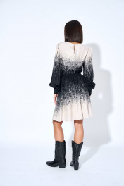 Платье женское, из костюмно-плательной ткани, полуприлегающего силуэта, отрезное по линии талии с втачным поясом (пояс с эластичной тесьмой). Верхняя часть переда и спинки присборена поясом, верхняя часть спинки со средним швом, в среднем шве обработан разрез горловины. Нижняя часть переда и спинки присборена по шву соединения с поясом. Рукава втачные, одношовные, длинные, окат и низ рукава присборен, с притачными манжетами. Манжеты с вставкой, вставка манжет с отделочными строчки, в ячейки которых продета эластичная тесьма. Пояс платья с отделочными строчками, в ячейки пояса продета эластичная тесьма. Горловина переда и спинки круглая, горловина спинки с застежкой на навесную петлю и пуговицу. Платье на подкладке.