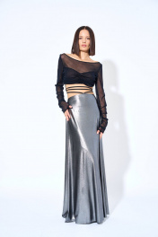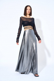 Юбка женская G482/8 Размеры: 40, 42, 44, 46, 48 Юбка женская из трикотажного полотна, расширенного к низу силуэта, на обтачке с застежкой на потайную тесьму-молнию, расположенную в среднем шве заднего полотнища. Переднее полотнище юбки с двумя шнурами (из окантовки), вставленными в шов обтачивания. Шнуры завязываются на талии. Заднее полотнище юбки со средним швом, эластичной тесьмой по талии. Юбка на подкладке.