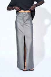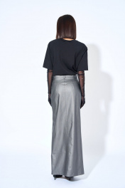 Юбка женская, из костюмно-плательной ткани, с притачным поясом, застежка юбки в верхней части среднего шва переднего полотнища юбки на тесьму-молнию, две кнопки по концам пояса. Переднее полотнище со средним швом, с боковыми карманами, обработанными в швах отрезных бочков, в среднем шве обработан разрез. Заднее полотнище юбки с талевыми вытачками, отрезной кокеткой, средним швом.