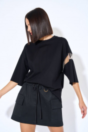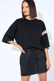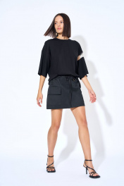 Юбка из костюмно-плательной ткани, короткая, на притачном поясе. Пояс с эластичной тесьмой, двумя обметанными петлями, в петли вставлен шнур из окантовки, завязывающийся на бант. Переднее полотнище юбки, с имитацией застежки в верхней части среднего шва, накладными карманами с клапаном. Юбка с патой на поясе, в пату продето полукольцо.