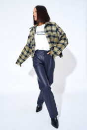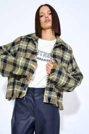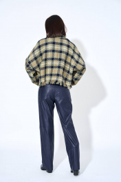 Жакет женский, из костюмной ткани, прямого силуэта, с центральной бортовой застежкой на шесть кнопок. Перед цельнокроеный с передними частями рукавов, с левой части переда накладной карман. Спинка цельнокроенная с локтевыми частями рукавов. Рукава цельнокроеные, одношовные, длинные. Воротник отложной с отрезной стойкой, стойка с застежкой на кнопку. Низ блузки и рукава с бахромой.