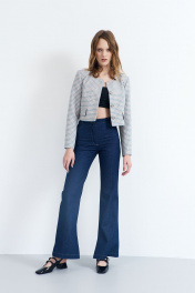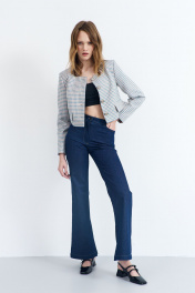 Жакет женский, из костюмно-плательной ткани, прямого силуэта с центральной бортовой застежкой на четыре петли и пуговицы. Перед с нагрудными вытачками из бокового шва, настроченными клапанами. Спинка с плечевыми вытачками. Рукава втачные, двухшовные, длинные. Горловина переда и спинки круглая. Жакет на подкладке, с плечевыми накладками.