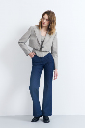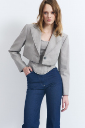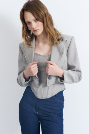 Жакет женский, из костюмно-плательной ткани, полуприлегающего силуэта с центральной бортовой застежкой на одну петлю и пуговицу. Перед с талевыми вытачками. Спинка с плечевыми вытачками, средним швом. Перед и спинка с отрезным бочком. Рукава втачные, двухшовные, длинные. Воротник отложной с отворотами из подбортов. Жакет на подкладке с плечевыми накладками. Низ переда и спинки, рукава, лацканы и воротник с необработанными срезами.