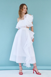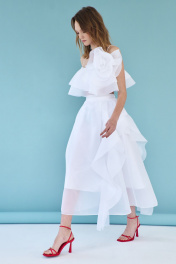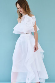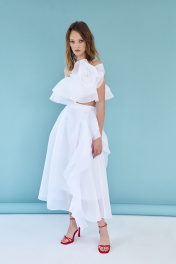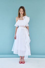 Блузка женская, из плательной ткани, полуприлегающего силуэта, короткая, на бретелях. Перед с вертикальными рельефами, спинка с средним швом, в среднем шве обработана застежка на разъемную тесьму - молнию. Перед и спинка с двумя воланами, вставленными в шов обтачивания горловины. На перед настрочен декоративный цветок. Блузка на подкладке.