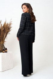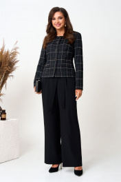 Стильный костюм, состоит из жакета и брюк. Жакет полуприлегающего силуэта, выполнен из высококачественной костюмной ткани с добавлением вискозы и модным принтом клетка. Жакет с округлой горловиной, по переду с застежкой на пуговицы, с листочкой, имитирующей карман, и пришивной маленькой пуговицей в виде декора. Жакет полностью на подкладке, по спинке с рельефами. Рукав втачной, полной дины. Модный брюки палаццо, выполнены из костюмной ткани с добавлением вискозы. Брюки на поясе, по бокам с резинкой, с застежкой по переду на молнию (20 см) и пуговицу. В комплекте с брюками идет съемный пояс из основной ткани.