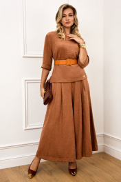 Стильный женский комплект, состоит из блузы и брюк-юбки. Блуза прямого силуэта с эффектом жатки, что придаёт изделию особый стиль. Блуза с нагрудными выточками, рукав длиной ¾, с манжетой, по бокам с небольшими разрезами (разрез 9 см). Перед блузки декорирован пришивной дизайнерской нашивкой. Брюки-юбка прямые, со складками по переду и спинке с эффектом жатки. Брюки-юбка на поясе, по бокам с резинкой, по спинке с застежкой на потайную молнию и пуговицу. В комплекте идет съемный кожаный пояс.