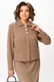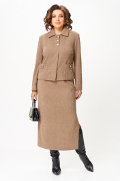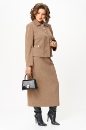 Трикотажный женский костюм из структурной ткани. Жакет прямого силуэта переду центральная застежка на 3-и петли и пуговицы и потайные кнопки. По переду накладные карманы декорированные цепью и застежкой на петлю и пуговицу. Спинка со средним швом без особенностей. Рукава втачные двухшовные. Юбка прямая длиной миди без подкладки. По правому боковому шву разрез. Для максимально комфортной посадки по поясу эластичная резинка.