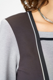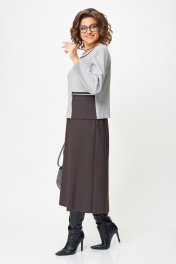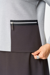 Этот стильный женский костюм из двух предметов сочетает в себе современный дизайн и практичность, идеально подходящий для повседневной носки или делового гардероба. Комплект включает тунику и длинную юбку, выполненные в гармоничной цветовой палитре из трикотажного полотна. Туника: Асимметричный крой с контрастной черной окантовкой. Основной цвет — светло-серый, с вставками темно-коричневого. Туника оснащена карманом с молнией, низ изделия фигурный, в правом боковом разрез (длина разреза 11 см) Рукав втачной одношовный длинный. Спинка ассиметричная с контрастной вставкой. Внутренняя подкладка отсутствует, что обеспечивает легкость и воздухопроницаемость. Юбка слегка расширена к низу длиной миди (до середины икры). По левой части переда юбки настрочной декоративный кант и разрез (длина разреза 30см). Застежка в левом боковом на потайную молнию с петлей и пуговицей. По спинке пояса эластичная резинка.