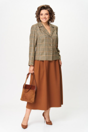 Комплект женский состоит из жакета и юбки. Элегантный женский жакет без подкладки с воротником пиджачного типа и застежкой на 3-и петли и пуговицы. По левой части переда накладной карман с декоративной нашивкой. Рукав втачной двухшовный со шлицей по низу и петлями с пуговицами. Юбка А-образного силуэта со складками по переду, в боковых швах карманы. Юбка на подкладке. Для максимально комфортной посадки по бокам пояса вставлена эластичная резинка. Длина жакета 50 см, длина рукава 60 см, длина юбки 85 см.