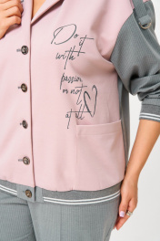 Костюм в стиле спорт-шик сочетающий в себе женственность и комфорт. Сочетание двух тканей трикотажного полотна и костюмной ткани добавляет оригинальность. Жакет со спущеным плечем и декорирован печатью по левой части переда, воротник пиджачного типа. По пинии плеча паты с полукольцом. Рукав втачной одношовный с манжетой по низу. Спинка с кокеткой и отлетной планкой. Понизу довяз и регулируемая кулиса. Брюки, слегка зауженные к низу, свободного силуэта. По переду вблизи боковых швов карманы. Для максимально комфортной посадки по поясу вставлена эластичная резинка.
