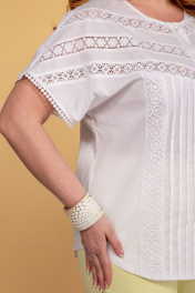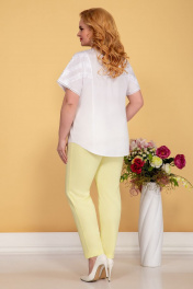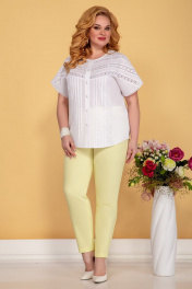 Комплект женский из ткани лен вишер (брюки цвет лимон) и блузки цвет белый. Блуза свободного кроя, со спущенным рукавом, застегивается на петли пуговицы, по переду защипы и вставки шитье кружево. Длина изделия по спинке 72,5 см. Брюки зауженные, по бокам на резинке. Длина брюк 102 см