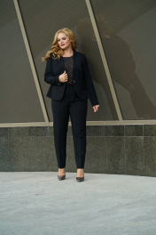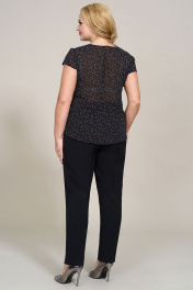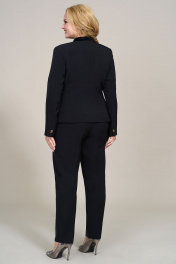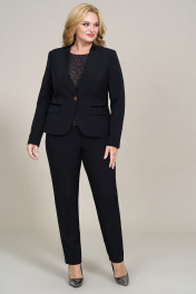 Жакет полуприлегающего силуэта с центральной застежкой на одну пробивную петлю и пуговицу. Перед с рельефными швами, с горизонтальными карманами с клапаном и двумя обтачками. Спинка со средним швом и рельефными швами, выходящими от линии проймы. Рукава втачные, двухшовные, низ декорирован пришивной пуговицей. Воротник – втачная стойка. Жакет на подкладке и с плечевыми накладками. Верхняя стойка воротника и обтачки карманов выполнены из отделочной ткани «Бархат». Длина жакета по среднему шву спинки – р44,46– 57, р48,50 – 58, р52,54,56-58 Длина рукава во всех р-ах -62 Ширина рукава на уровне глубины проймы ½ - р44-16,3, р46-17, р48-17,7, р50 – 18,4, р52-19,6, р54-20,3, р56-21 Ширина плеча – р44-11, р46-11,2, р48-11,4, р50-11,4, р52-11,2, р54-11,4, р56-11,6 ОГ – р44-92, р46-96, р48-100, р50-104, р52-106, р54-110, р56-114 ОТ – р44-78, р46-82, р48-86, р50-90, р52-96, р54-100, р56-104 ОБ (по линии низа) – р44-96, р46-100, р48-104, р50-108, р52-114, р54-118, р56-122 Блуза полуприлегающего силуэта с фигурной линией низа. Перед с нагрудными вытачками. Застежка по ценру горловины спинки на навесную петлю и пуговицу. Рукава – крылышко со сборкой по окату. Длина блузы по среднему шву спинки – р44,46,48 – 59, р50-61, р52,54,56-61 Длина рукава – р44,46,48 – 12, р50-13, р52,54,56 - 12 Ширина плеча – р44-7,7, р46-7,8, р48-7,9, р50-8, р52-9,7, р54-10, р56-10,3 ОГ – р44-92, р46-96, р48-100, р50-104, р52-108, р54-112, р56-116 ОТ – р44-92, р46-96, р48-100, р50-104, р52-107, р54-111, р56-115 ОБ – р44-97, р46-101, р48 Брюки длинные со сгибом, на притачном поясе с пятью шлевками. Застежка на тесьму-молнию и одну петлю и пуговицу в среднем шве. Передние части с имитацией косых боковых карманов. Задние части с талиевыми вытачками. Р52, 54, 56 пояс с резинкой по боковым швам. Длина брюк от талии по боковому шву - р44-101, р46-102, р48-103, р50-104, р52-104, р54-105, р56-106 ОТ – р44-74, р46-78, р48-82, р50-86, р52(с раст рез)-100, р54(с раст рез)-104, р56(с раст рез)-108 ОБ –р44-96, р46-100, р48-104, р50-108, р52-112, р54-116, р56-120
