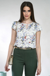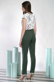 Блуза полуприлегающего силуэта с фигурной линией низа. Перед с нагрудными вытачками. Рукав-крылышко. Длина блузы по среднему шву спинки – р44,46,48 – 58, р50-60 Длина рукава во всех р-ах -12,5 Ширина плеча – р44-8, р46-8,8, р48-8,7, р50-8 ОГ ½ -р 44-46,5, р46-48,5, р48-50,5, р50-52,5 ОТ ½ -р 44-46, р46-48, р48-50, р50-52 ОБ ½ -р 44-49, р46-51, р48-53, р50-55 Брюки длинные со сгибом, на притачном поясе с пятью шлевками. Застежка на тесьму-молнию и одну петлю и пуговицу в среднем шве. Передние части с имитацией косых боковых карманов. Задние части с талиевыми вытачками. Длина брюк от талии по боковому шву - р44-101,5, р46-102,5, р48-103,5, р50-104,5 ОТ ½ - р44-37,5, р46-39,5, р48-41,5, р50-43,5 ОБ ½ - р44-48, р46-50, р48-52, р50-54