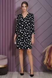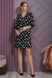 Платье силуэта А-образной формы с разрезом по среднему шву спинки и застежкой на одну пелю-пуговицу. Перед с нагрудными вытачками. Рукава одношовные, длиной ¾, со сборкой по окату и двумя мягкми застроченными складками по низу. Платье без подкладки. Длина платья по среднему шву спинки – р46,48 – 91, р50,52 – 93 Длина рукава во всех р-ах -52 Ширина рукава на уровне глубины проймы ½ - р46-21,8, р48-22,5, р50-23,7, р52-24,4 Ширина плеча – р46-9,2, р48-9,4, р50-9,6, р52-9,8 ОГ ½ - р46-48, р48-50, р50-52, р52-54 ОТ ½ - р46-49, р48-51, р50-53, р52-55 ОБ ½ - р46-53, р48-55, р50-57, р52-59