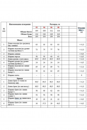 Жакет прямого, свободного силуэта понизу спинки степень прилегания фиксирует резинка, с центральной застёжкой на петли, пуговицы. Перед с прорезными карманами с листочкой. Рукава цельнокроеные со спинкой переходящие на перед, длиной ¾, понизу с притачными манжетами. Воротник пиджачного типа. Декорированный нашивкой по левой стороне переда. Брюки типа «банан», на притачном поясе на резинке. Передние части с косыми боковыми карманами, по центру от низа выточка.