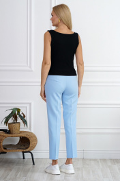 Жакет прямого силуэта, частично на подкладке (перед и спинка), с центральной застёжкой на петлю и пуговицу, по линии талии кулиса с отделочным шнуром с фиксаторами, фиксируемый степень прилегания. Перед с отложными лацканами, с прорезными горизонтальными карманами с двумя обтачками и клапаном. Спинка со средним швом. Рукава втачные, двухшовные, длинные. Воротник отложной с отворотом. Брюки длиной 7/8, со сгибом, на широком притачном поясе состоящим из частей. Застежка обработана в среднем шве на тесьму-молнию типа «гульфик» и по краю пояса на две петли и пуговицу. Передние части с имитацией боковых косых карманов. Задние части с талевыми выточками. Топ полуприлегающего силуэта, вырез горловины формы «карэ».