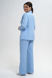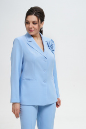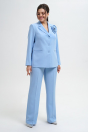 Жакет полуприлегающего силуэта, частично на подкладке (перед, спинка), с центральной застёжкой на петли, пуговицы. Декорированный съёмным украшением. Перед с отложными лацканами, с рельефными швами, отрезным бочком, прорезными карманами с двумя обтачками. Спинка со средним швом. Рукававтачные, двухшовные, длинные, в локтевой шве шлица декорированная пуговицами. Воротник пиджачного типа. Брюки длинные, типа «клёш» прилегающего силуэта по бёдрам и от линии колена идут на расширение, со сгибом, на притачном поясе, застежкатипа «гульфик» на тесьму-молнию, петлю и пуговицу по поясу. Задние части с талевыми выточками.