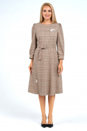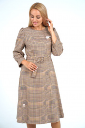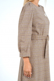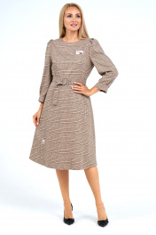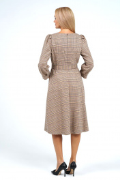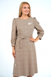 Платье полуприлегающего силуэта верху расширенное книзу, отрезное по линии талии, с застёжкой на потайную тесьму-молнию в среднем шве спинки, с завязывающимся поясом. Перед с нагрудными выточками. Спинка по верхней части с талевыми выточками. Рукава втачные, одношовные, длиной ¾, по окату и низу с мягкими складками с притачными манжетами. Декорировано нашивками по верхней и нижней части переда.